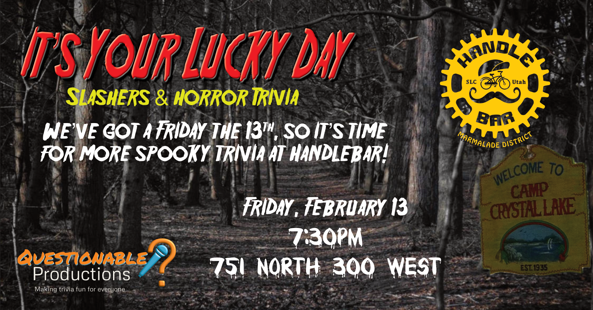 Back to All Events Your Lucky Day Friday, February 13, 2026 7:30 PM 9:30 PM Google Calendar ICS Our lucky tradition continues, with another horror trivia night. Come out to Handlebar for a whole new edition of creeps, creeks, freaks, and more. Grab your crew because it’s dangerous to go alone!