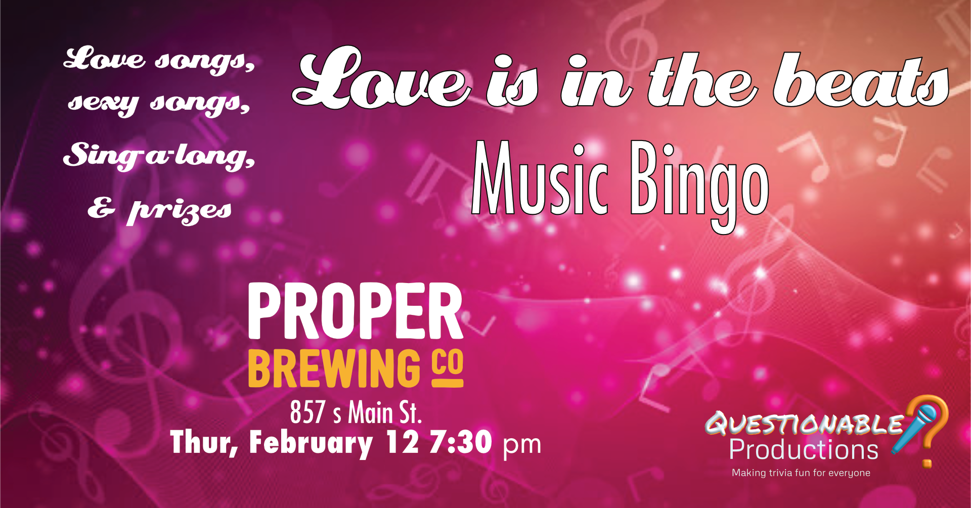 Back to All Events Valentine's Music Bingo Thursday, February 12, 2026 7:30 PM 9:30 PM Google Calendar ICS From love songs to songs about getting it on, we’ll be playing songs as you mark them on your cards, and some lucky ducks will win! Join us and get in the mood for the holiday weekend.