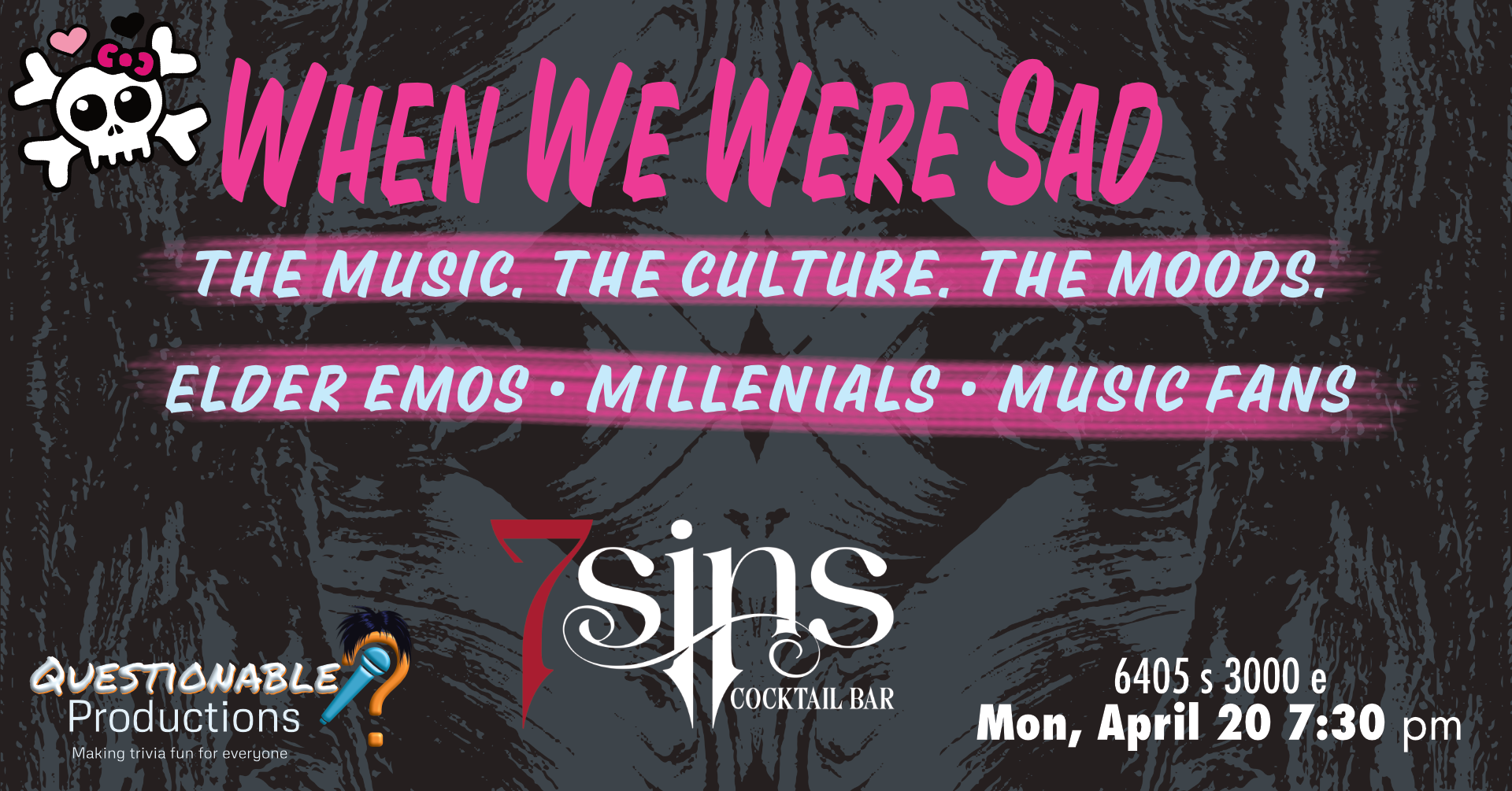 Millennials of age or heart will have the best time remembering this great era of culture, music, & everything that made us who we are. Free to play, great prizes, the best music, great food & drinks! Come see the ALL-NEW 7Sins Cocktail bar (formerly Elixir Lounge) and party at the mouth of the canyons.